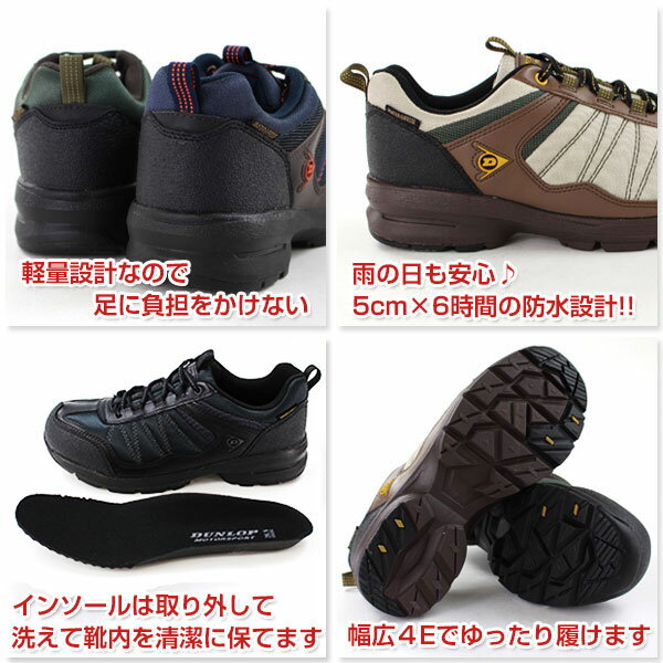 ソール部からアッパーにかけて5cm×6時間の防水機能 ・軽やかな歩行のための軽量設計!ゆったりとした履き心地の幅広4E!中敷きは取り外せるので洗えて靴内を清潔に保てる ■ブランド DUNLOP ダンロップ ■商品名/品番 DU666 ■カラー モスグリーン(緑色) ウォームグレー(灰色) ダークブラウン(焦茶色) ネイビー/ブラウン(紺色/茶色) ブラック(黒色) ■取扱いサイズ 24.0cm/24.5cm/25.0cm/25.5cm/26.0cm 26.5cm/27.0cm/28.0cm/29.0cm/30.0cm ■素材 《アッパー》合成皮革/ポリエステル 《アウトソール》合成底 ■ワイズ(横幅) ゆったり幅広4E(EEEE) ■靴の詳細 (26.0cm採寸) 《ソール高》接地面より約 4.0 cm 《履き口までの高さ》約 11.5 cm(ソール部分も含む) 《履き口周り》紐で調節出来ます 《重量》片足 約 316 g ■サイズについて こちらの商品は【標準サイズ(幅広4E)】です。